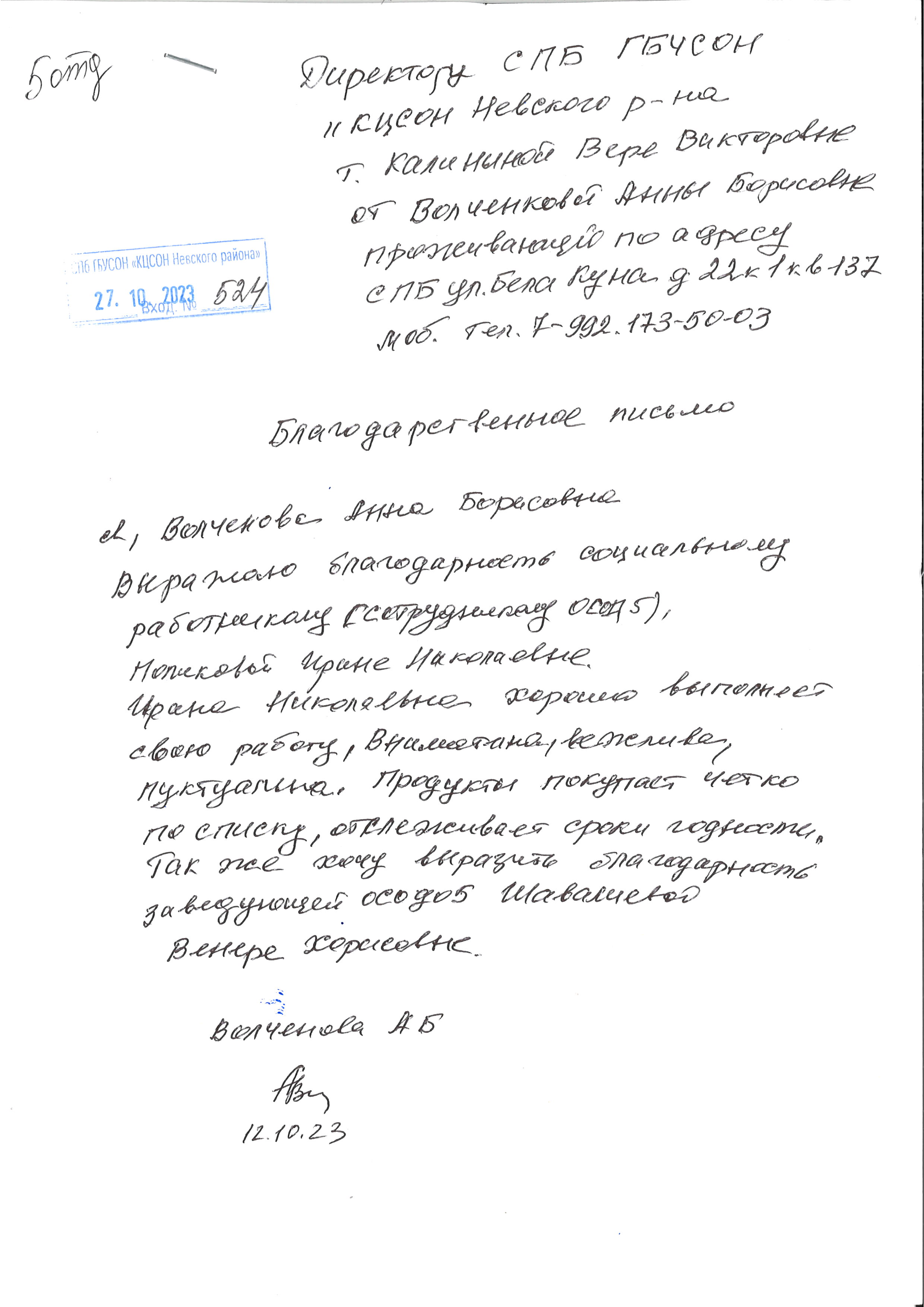 Благодарность заведующей и соцработнику ОСОД №5