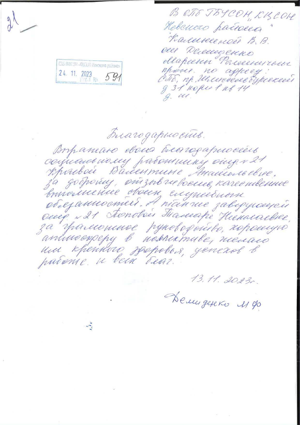 Благодарность заведующей и соцработнику ОСОД №21