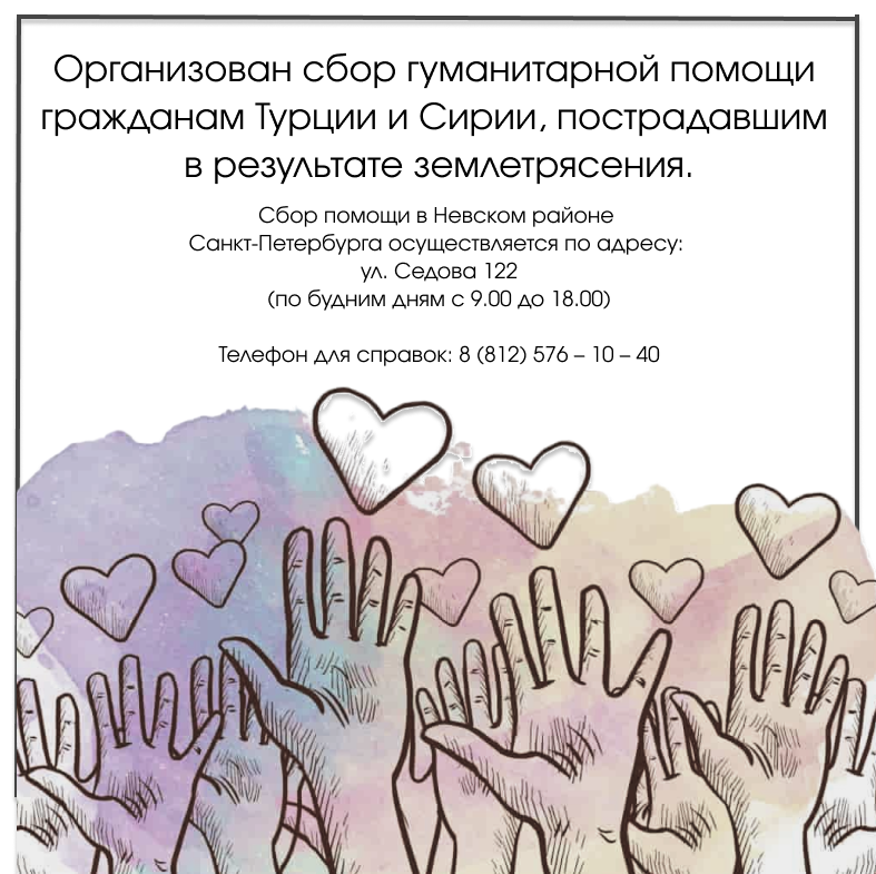 Сбор гуманитарной помощи в Невском районе Санкт-Петербурга осуществляется по адресу: - ул. Седова 122 (по будним дням с 9.00 до 18.00); СПб ГБУ «Комплексный центр социального обслуживания населения Невского района».