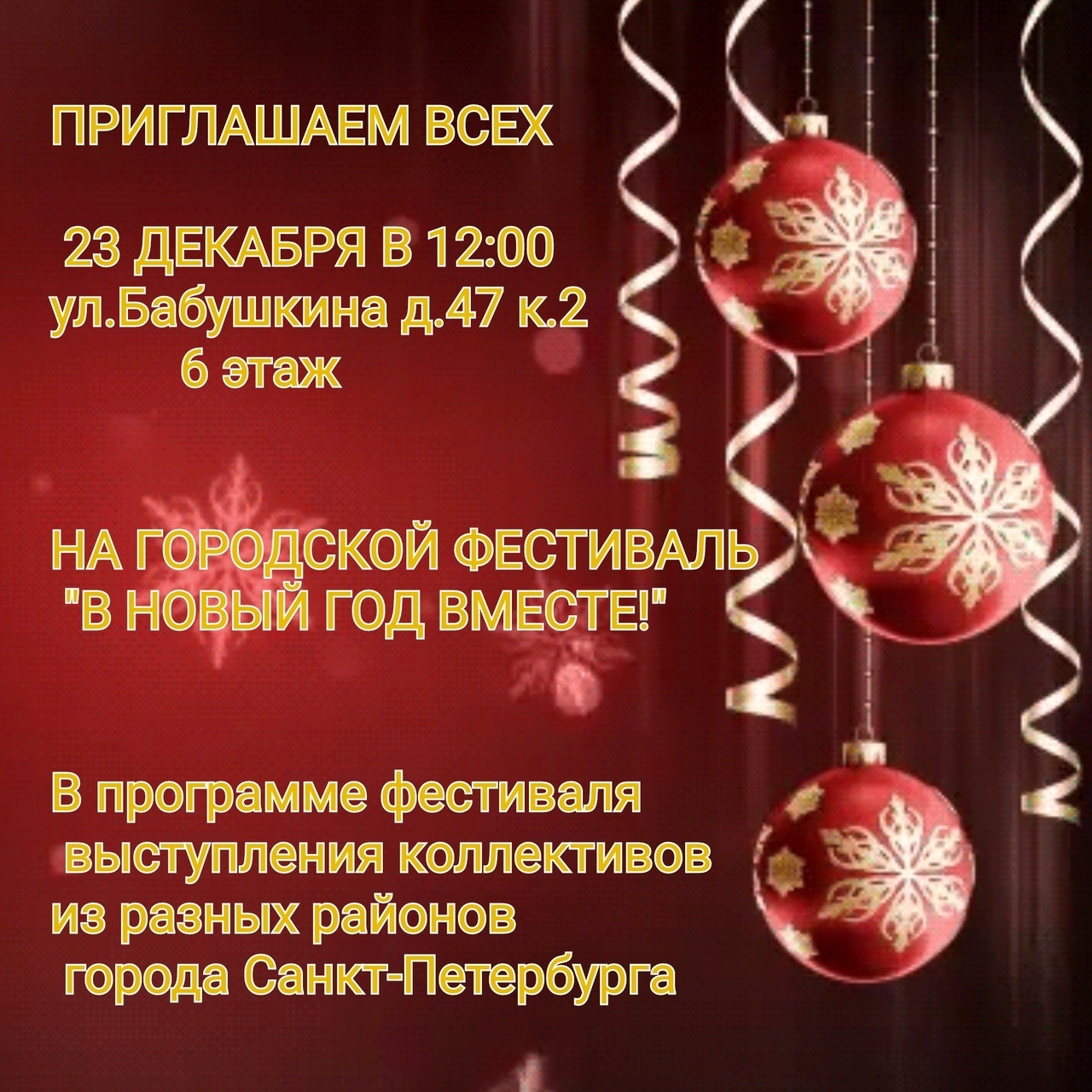 Приглашаем всех 23 декабря в 12.00 на ул. Бабушкина д.47 к.2 6 этаж на городской фестиваль "В Новый год вместе!"