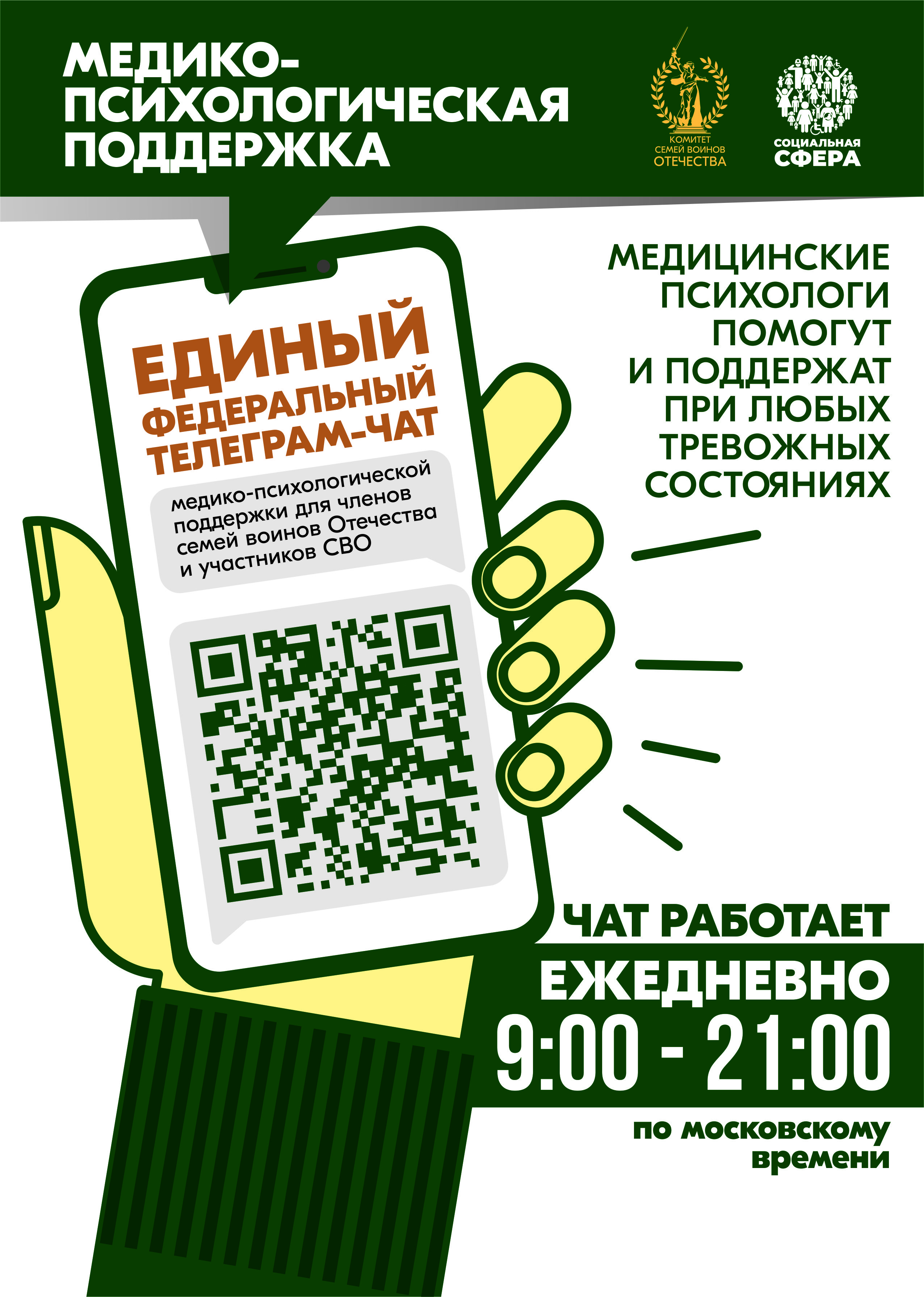 За два месяца работы чата обработано более 400 обращений. Уже подключилось 6800 человек. Организаторы: Комитет семей воинов Отечества (КСВО) и Фонд «Социальная сфера» (команда федерального проекта «ЗдравКонтроль») при поддержке Общественной палаты РФ.